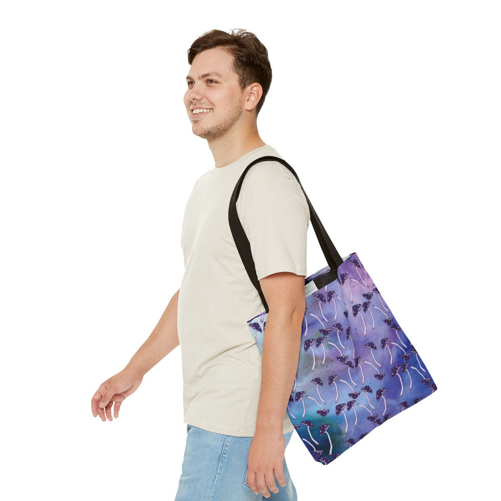 Wander into a world where nature meets the cosmos with our Stellar Shrooms Tote, exclusively from Paradigm Shift Design Shop. This enchanting design features hand‑illustrated purple mushrooms, each brimming with whimsical detail, set against a dreamy galaxy‑inspired watercolor backdrop awash in deep purples and blues.