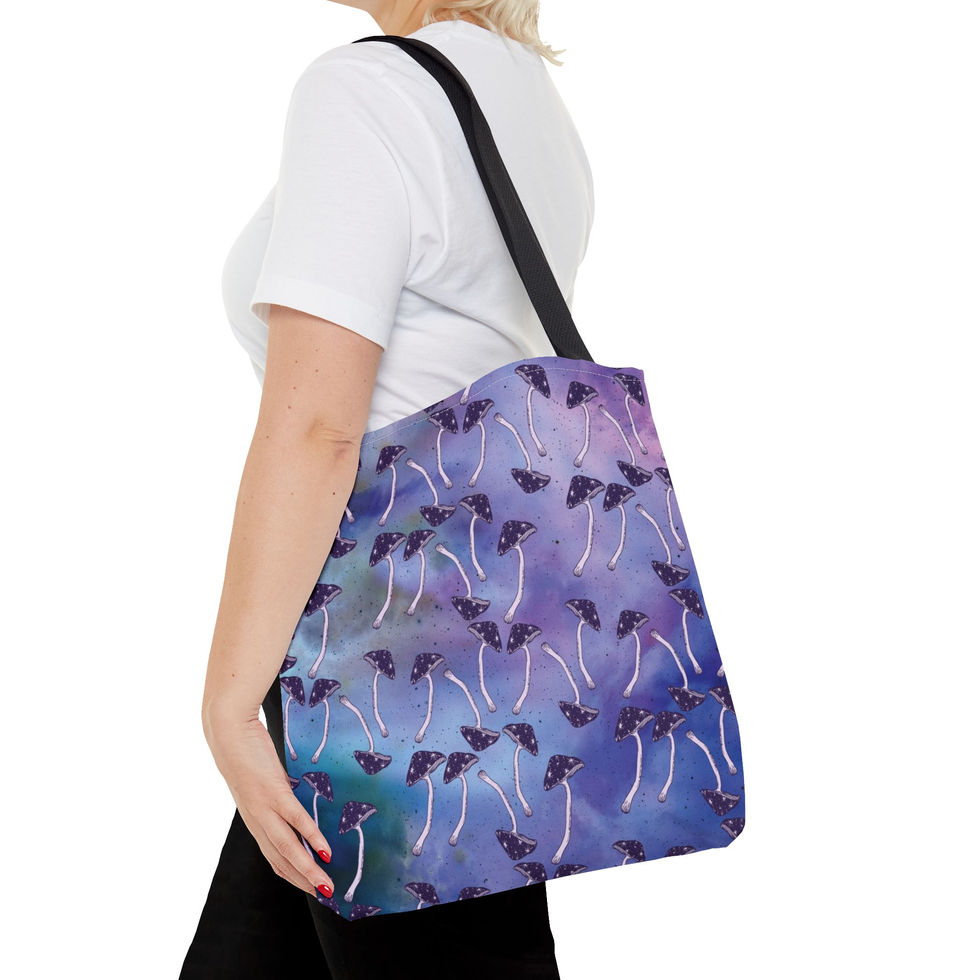 The blend of earthy mushroom shapes with the vastness of a star‑speckled cosmic sky creates a magical, otherworldly aesthetic—perfect for free spirits, stargazers, and lovers of the strange and beautiful. Whether you’re picking up books from the library, gathering treasures from the farmer’s market, or packing essentials for a forest stroll, this tote turns every outing into an adventure.